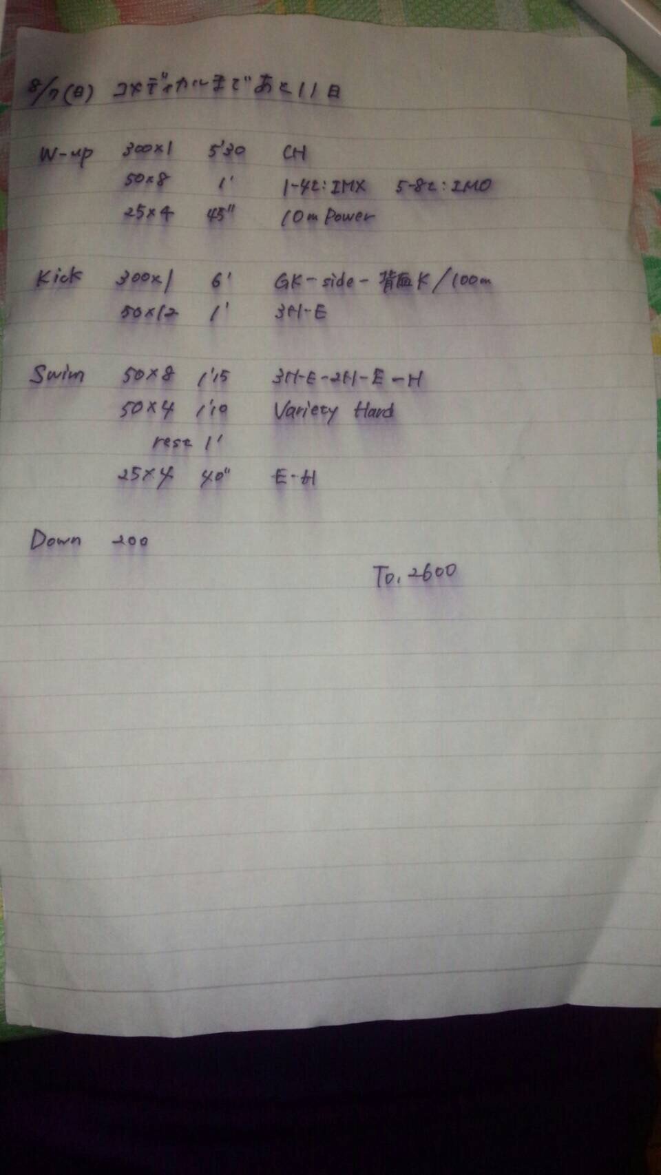 今日は、コメディカルで泳ぐ種目の距離が長い人と、短い人とで分けて違うメニューをしました。僕はコメディカルで泳ぐ種目は距離が短いので短い人用のメニューをしました。