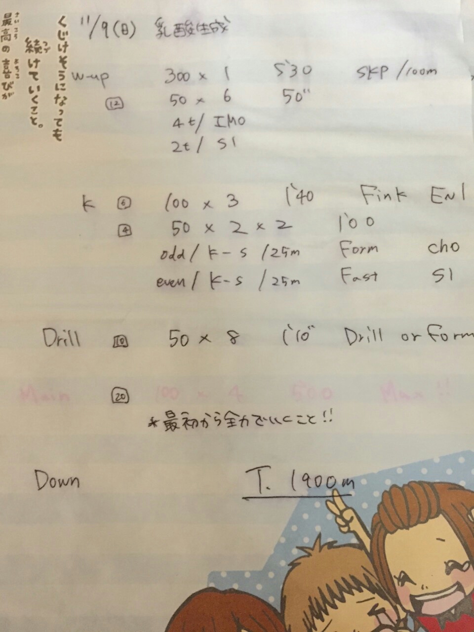 今日初めて乳酸という練習をしました。サークル的にいけるだろうと思っていましたがあまかったです。めちゃしんどかったです。1本泳ぐごとに腕がパンパンでした。筋トレは体幹とマシンをやりました。