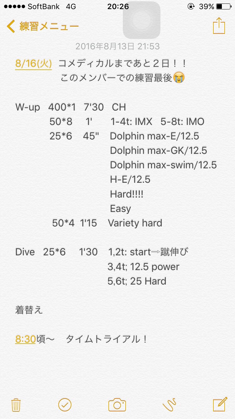 一昨日はコメディカル前以来、1週間ぶりの練習だったので思うように泳げませんでしたが、昨日はしっかり泳げていたのでこのまま調子を上げていきたいと思います。