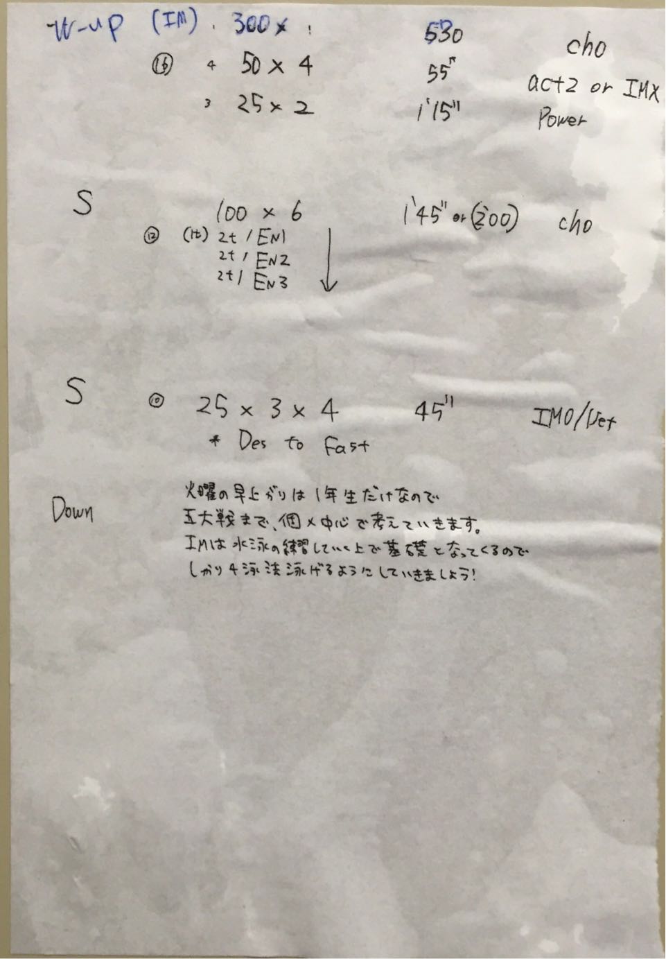 もがいているだけになってしまいました。他にも改善しないといけないところがたくさんありましたが、とりあえずこの2つは明日の100バタで気をつけようと思いました。