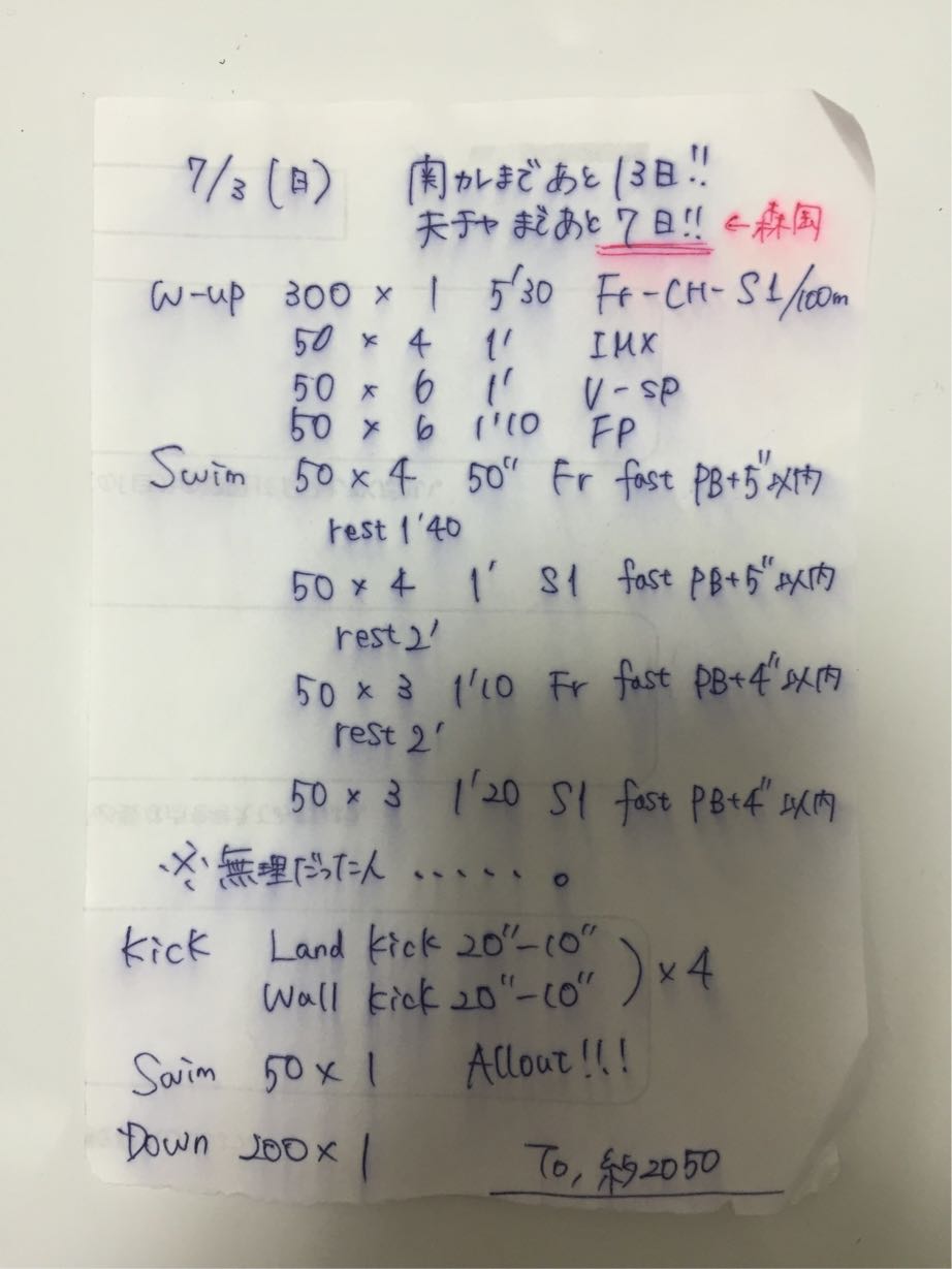 今日のメニューはkickを主軸としたメニューでした。僕は50mkickを1分サークルで3本行くのが精一杯で足の弱さを痛感しました。またkickのあとのswimでは2セット目がバテバテで良いタイムが出ませんでした。当分の目標としては体力の増強と足を強くすることを目標にしていこうと思います。