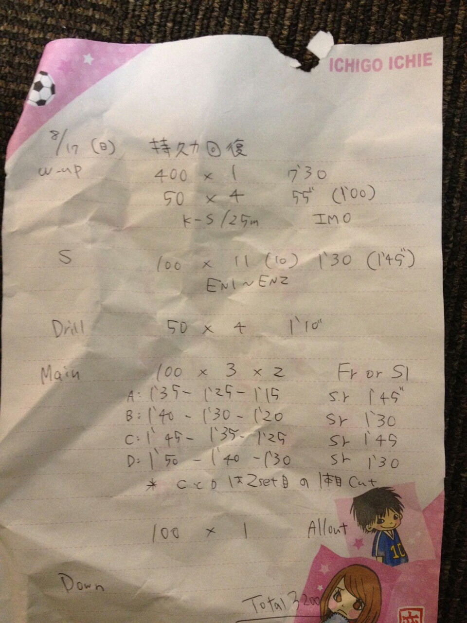 100m10本がありました。とてもしんどかったです。4本目くらいまで数えてたのですが途中からそんな余裕もなくなりました。とにかく同じタイムでまわることを目標にしていましたが6本目くらいからタイムが落ちはじめ最後は腕がまわりませんでした。そして、今日はなみさんから目標の発表がありました。