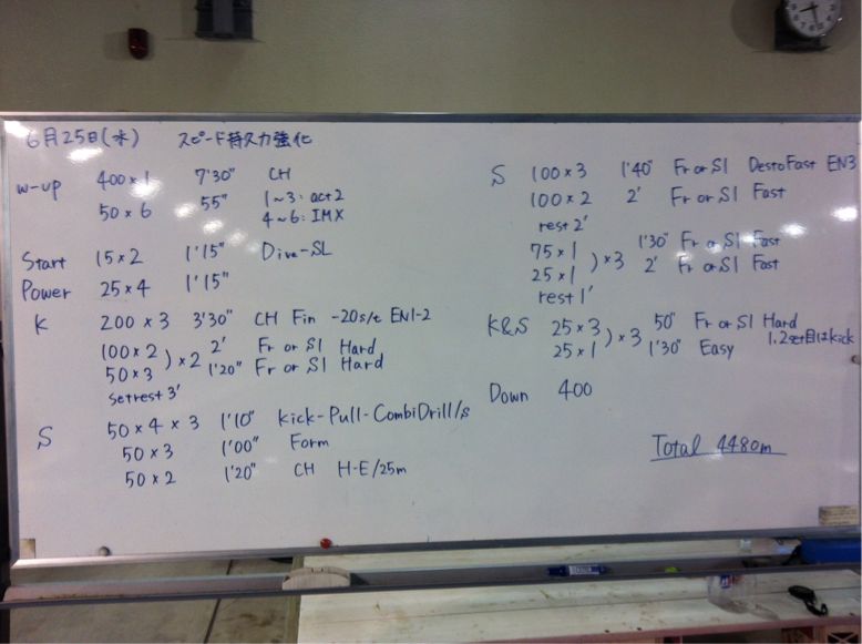 わたしは最後とキックあたりへとへとになっていましたが久しぶりに6000くらい泳げてとても良かったです。Frも最近感覚がおかしかったですが今日は大きく泳げました。赤松くんが後ろから迫ってくるので頑張りました。とてもいい練習ができたとおもいます。